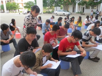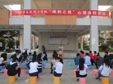 一群學生拿著自己畫好的畫,圍著我校馮艷丹、宋璐、吳玉云三位心理老師,訴說自己的構圖思路,表明自己這段時期的心情,這就是4月10日在我校8號樓廣場舉辦的“綠韻之畫”心情涂鴉活動現場。