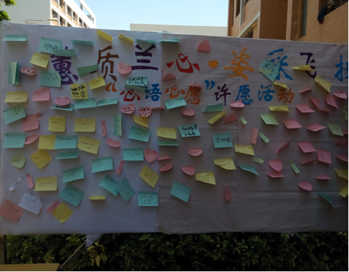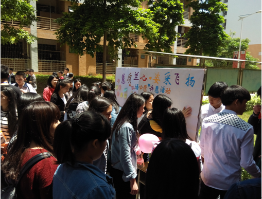 中午放學(xué)時分,“心語心愿”活動在女生宿舍大門舉行,吸引了大批同學(xué)參加,宿舍門口排起了長龍。同學(xué)們在許愿墻寫下對女生的祝福及心愿,并獲得一個由宿管會贈送的氣球,將祝福傳遞給每一個同學(xué)。