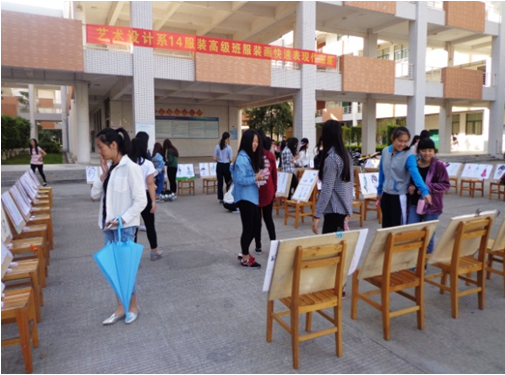為進(jìn)一步活躍校園藝術(shù)文化氣氛,加強(qiáng)學(xué)生交流,展示藝術(shù)設(shè)計(jì)系優(yōu)秀藝術(shù)底蘊(yùn)。4月14日,藝術(shù)設(shè)計(jì)系在八號(hào)樓廣場(chǎng)舉辦了14服裝高級(jí)班服裝畫快速表現(xiàn)作品展。
