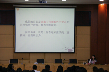 眾所周知,愛(ài)美是人之天性,尤其是對(duì)于年輕女生更是如此。為此,朱靜雯老師以飽含激情的演繹方式,對(duì)化妝和卸妝技巧做了生動(dòng)詳細(xì)的介紹,吸引同學(xué)們的注意,贏得了同學(xué)們的陣陣掌聲。