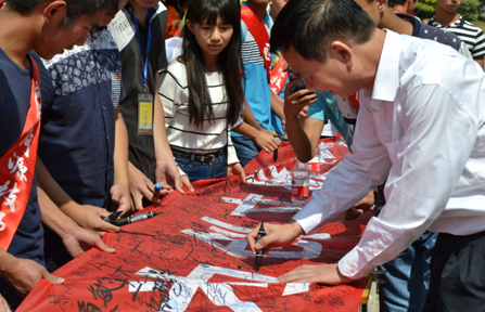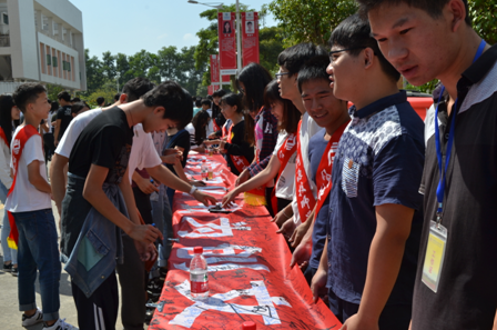 中午時(shí)分,黎海波院長(zhǎng)也來到了活動(dòng)現(xiàn)場(chǎng)。他大力稱贊學(xué)生干部工作出色,舉辦這樣的活動(dòng)很有意義,既可以傳承中華文化,又可以活躍校園氣氛、構(gòu)建文明校園,為創(chuàng)文出力。他激動(dòng)地在橫幅上簽字留言,身先垂范,鼓勵(lì)青年學(xué)生一起勇于擔(dān)當(dāng),傳承中華傳統(tǒng)文化。受到院長(zhǎng)的感染,駐足觀望的同學(xué)們也紛紛參與到活動(dòng)當(dāng)中,掀起活動(dòng)的新高潮。
