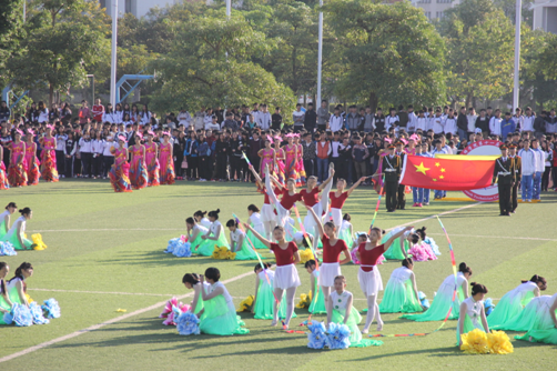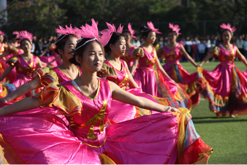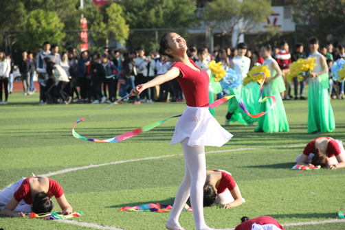 我院學生為田徑運動會獻舞。朝氣蓬勃的青年學生,用舞姿展示他們的活力,譜寫下屬于他們的青春和舞蹈《盛世年華》。富有西班牙特色、身穿斗牛舞裙的女孩們,剛?cè)岵ぐ憾挥卸分?,張揚了田徑運動會拼搏進取的風姿風采,向青春致禮。