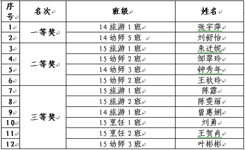 12月4日,旅游服務(wù)系開(kāi)展的“遠(yuǎn)離毒品,珍愛(ài)生命”主題征文比賽落下帷幕。在前期主題班會(huì)、觀看禁毒宣傳片的感染和帶動(dòng)下,同學(xué)們都有感而發(fā),上交的作品有的在寫(xiě)自己的觀后感,有的述說(shuō)自己對(duì)毒品的認(rèn)識(shí),有的則以議論文的形式抒發(fā)所悟……最終,14旅游1班的張宇萍同學(xué)和14幼師5班的劉舒怡同學(xué)獲得征文比賽的一等獎(jiǎng)。