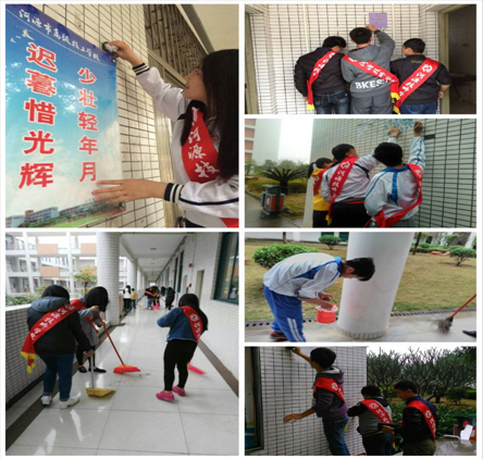 三月的校園,除了春意盎然,還有很多活躍在校園各個(gè)角落的志愿者們。他們或拿清掃工具,或拿粉刷工具,活躍在校園教學(xué)樓層、宿舍架空層、校道等區(qū)域,統(tǒng)一行動(dòng),合力清掃校道,清除校園“廣告牛皮癬”和墻壁的污漬,美化校園各個(gè)角落。
