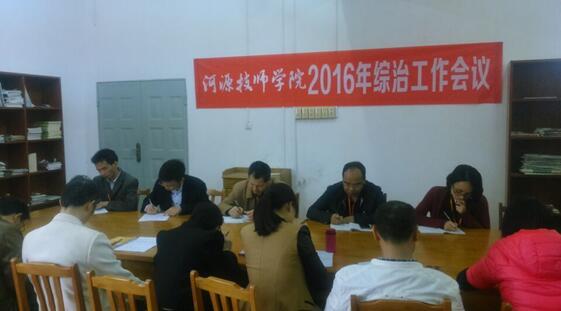 劉俊侃副院長總結(jié)了學院2015年綜治工作情況,向與會人員傳達了河源市綜治會議精神和河源市2016年平安創(chuàng)建暨綜治工作要點,要求各部門認真學習,深刻領(lǐng)會,抓好落實。他結(jié)合學院綜治工作實際,提出了四點意見。一是各部門要分工協(xié)作,加強溝通,強化各級責任,落實學院綜治工作任務(wù);二是要加強對學生的各項安全教育,排查安全隱患,落實整改措施;三是要強化宣傳教育,強化師生思想認識教育、安全技能教育、心理健康教育等提升防范能力。四是要強化綜合治理,加強督促檢查。劉俊侃副院長強調(diào),安全穩(wěn)定工作是推動學院事業(yè)發(fā)展的前提保障,必須常抓不懈,警鐘長鳴。