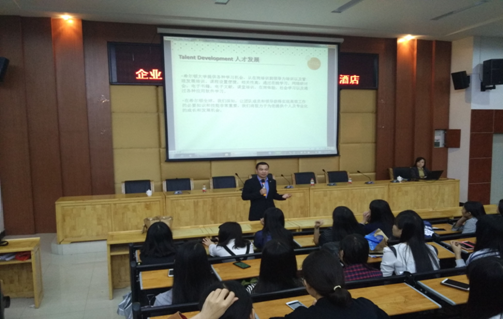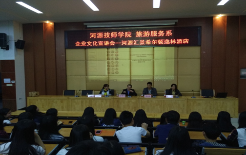 為給2014級的準(zhǔn)畢業(yè)生們提供更好的就業(yè)機(jī)會,進(jìn)一步了解企業(yè)文化,2016年4月12日晚,旅游服務(wù)系在培訓(xùn)樓講學(xué)廳舉行河源匯景希爾頓逸林酒店企業(yè)文化宣講會。希爾頓逸林酒店人力資源段景雙總監(jiān)、吳上清經(jīng)理、旅游服務(wù)系謝龍桂主任、劉曉霞副主任以及2014級酒店、烹飪專業(yè)的全體學(xué)生參加了此次宣講會。
