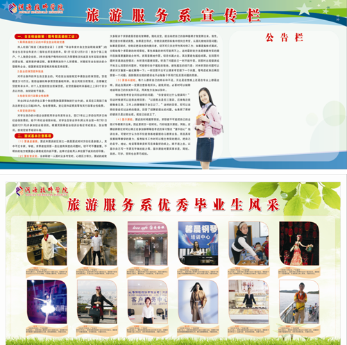 5月下旬,旅游服務(wù)系更新宣傳欄內(nèi)容,充分利用宣傳欄這塊陣地集中宣傳面試技巧、面試禁忌等內(nèi)容,同時(shí)還專門開(kāi)辟了往屆優(yōu)秀畢業(yè)生風(fēng)采展板塊,旨在樹(shù)立榜樣示范作用,帶動(dòng)學(xué)生。