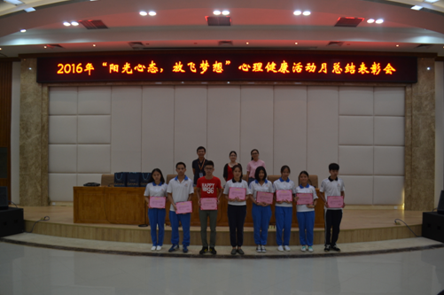 2016年6月22日晚,我院在圖書館報告廳舉行2015—2016學(xué)年第二學(xué)期以“陽光心態(tài) 放飛夢想”為主題的心理健康活動月總結(jié)表彰會。學(xué)生科柳鐵非副科長、心理學(xué)吳玉云老師、謝麗娟老師及各班心理委員、學(xué)生代表參加了會議。