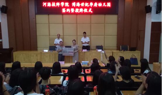 2017年6月13日晚,我院與博海世紀(jì)華府教育機(jī)構(gòu)校企合作的簽約儀式在培訓(xùn)樓講學(xué)廳隆重舉行。學(xué)院副院長梁秋生、教務(wù)科副科長徐勇軍、旅游服務(wù)系主任謝龍桂,副主任陳偉寧,以及博海世紀(jì)華府教育園長和幼師專業(yè)中級班全體學(xué)生參加了此次儀式。