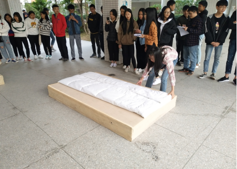 為培養(yǎng)學(xué)生整理內(nèi)務(wù)的能力,提高學(xué)生自強(qiáng)自立的生活能力。2017年11月21日下午,我院學(xué)管中心在培訓(xùn)樓廣場(chǎng)舉行了疊被子比賽。