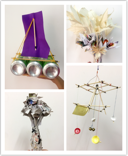 同學(xué)們利用空瓶子、廢紙、冰棒棍、一次性筷子等生活中輕易可見的廢品,充分發(fā)揮智慧和創(chuàng)意,制作出了拼圖、美麗的紙花、風(fēng)鈴、筆筒等實(shí)用的生活必需品,既解決了廢品處理困難的問題,又培養(yǎng)了勤儉節(jié)約的品格。