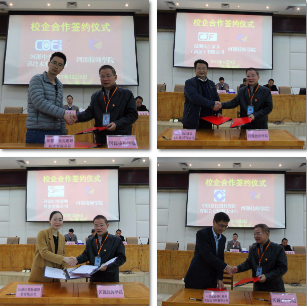 會上,梁秋生副院長宣讀了《河源技師學(xué)院關(guān)于調(diào)整專業(yè)建設(shè)指導(dǎo)委員會委員的決定》,并代表學(xué)院與河源中光電通訊技術(shù)有限公司、深圳長江家具(河源)有限公司、河源巴登新城投資有限公司、中國建設(shè)銀行股份有限公司河源市分行、河源巴伐利亞莊園福朋喜來登度假酒店、佛山市順德海爾電器有限公司、雅閣酒店管理(北京)有限公司、深圳市新飛龍柴油機有限公司、木林森股份有限公司、東莞南陽橡膠制品有限公司、河源市志良網(wǎng)絡(luò)科技有限公司、河源市新銳網(wǎng)絡(luò)科技有限公司12家合作企業(yè)簽約。