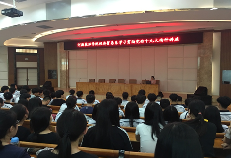 2018年4月23日下午,我院經(jīng)濟貿(mào)易系在圖書館報告廳舉辦了“學(xué)習(xí)貫徹黨的十九大精神”專題講座。講座由經(jīng)濟貿(mào)易系賴珊珊老師擔(dān)任主講,經(jīng)濟貿(mào)易系黨支部全體黨員、經(jīng)貿(mào)系團總支書記及全體同學(xué)參加了學(xué)習(xí)。