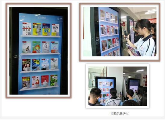 圖書館大門兩側(cè)豎立著大屏幕的電子閱覽器,同學(xué)們只需動(dòng)動(dòng)手指,掃掃二維碼就可以下載有聲圖書免費(fèi)聽。