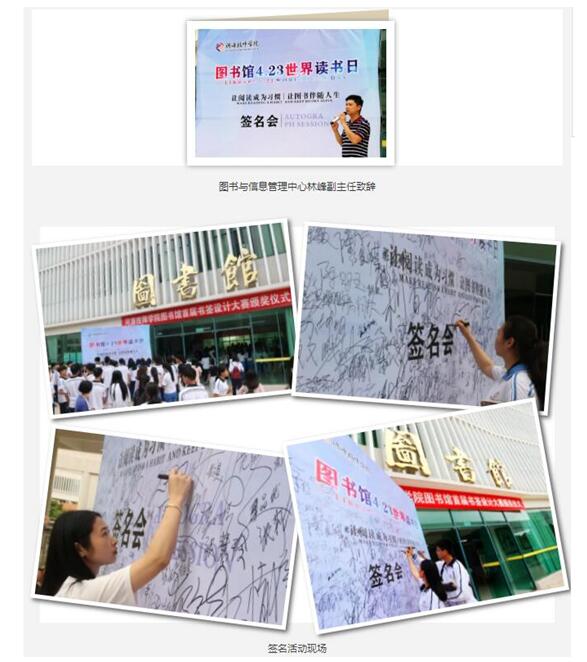 同學(xué)們用筆在背景墻上簽名,參與到“全校閱讀·我行動(dòng)”的行列當(dāng)中來。圖書與信息管理中心林峰副主任指出,借世界讀書日到來之際,圖書館開展系列讀書活動(dòng),歡迎同學(xué)們積極參與,希望同學(xué)們當(dāng)閱讀使者,讓閱讀成為習(xí)慣。