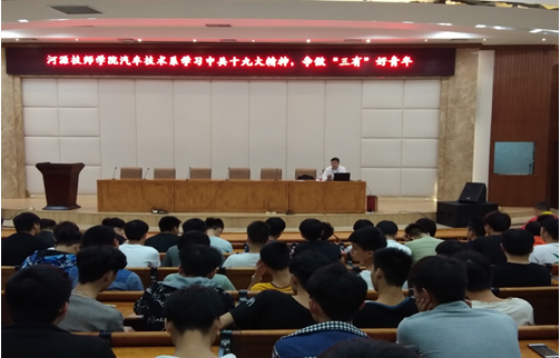 為深入貫徹落實黨的十九大精神,更好地加強青年學生思想教育和指導,2018年4月26日,汽車技術系在圖書館講學廳召開了“學習十九精神,做‘三有’好青年”的主題講座。講座由汽車技術系黨支部書記石功名主講,系部全體師生參加。