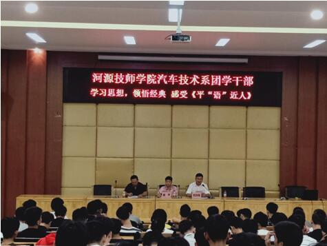 2018年11月6日下午,我院汽車技術(shù)系在培訓樓講學廳舉行了“學習思想,領(lǐng)悟經(jīng)典,感受《平“語”近人——習近平總書記用典》”學習活動。汽車技術(shù)系石功名主任、謝平副主任、團總支書記鄭文富,以及系部團學會全體成員參加了此次學習活動。