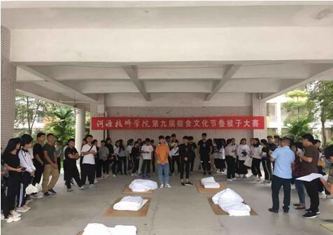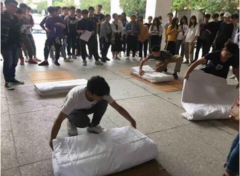 2018年11月12日下午,學(xué)院第九屆宿舍文化節(jié)之疊被子大賽在培訓(xùn)樓廣場順利開展。比賽邀請生活老師擔(dān)任評委,全院各寢室代表參加了此次比賽。