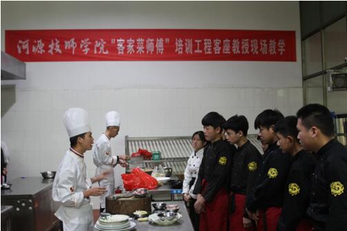 結(jié)合《粵菜師傅風(fēng)味系列—客家風(fēng)味菜烹調(diào)工藝》培訓(xùn)教材開發(fā)需要, 2019年3月2日-3日,在學(xué)院院長張海鋒、副院長梁秋生的組織下,河源技師學(xué)院烹飪專業(yè)客座教授楊明輝、黃文鋒、劉順煌三位企業(yè)大廚為學(xué)生現(xiàn)場展示了河源風(fēng)味菜的制作。