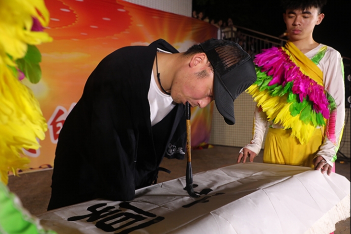表演者秦帥以嘴代手,揮舞筆墨書寫下“厚德載物”四個(gè)遒勁有力的大字,展現(xiàn)書法的魅力,激勵(lì)全體同學(xué)自強(qiáng)不息,并將作品贈(zèng)送給學(xué)校以表謝意。