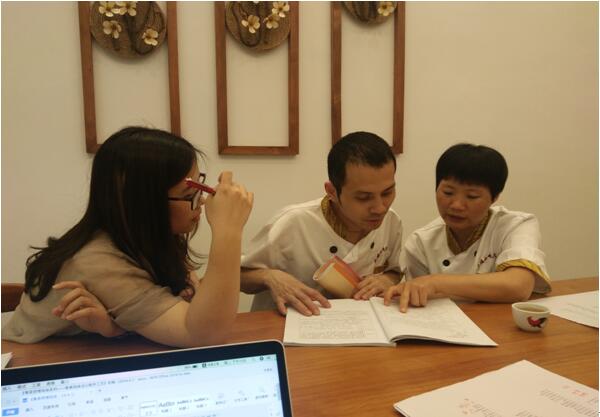 (圖二)梁自敏老師與大埔小吃文化城的點(diǎn)心師傅校對教材