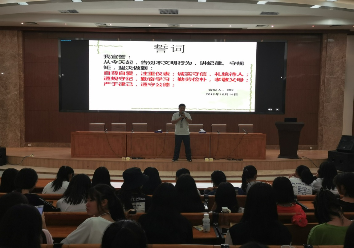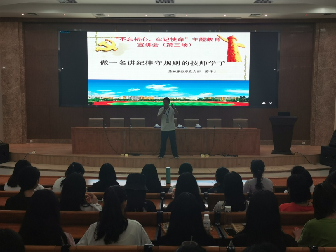 按學(xué)院黨委關(guān)于扎實抓好基層黨支部“不忘初心、牢記使命”主題教育的工作部署,2019年10月14日晚,旅游服務(wù)系黨支部在圖書館報告廳開展了“做一名講紀(jì)律守規(guī)則的技師學(xué)子”主題講座。講座由旅游服務(wù)系黨支部書記陳偉寧主講,該系2019級全體學(xué)生聆聽了講座。