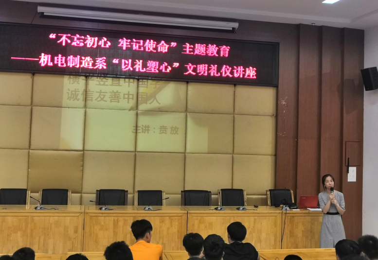 根據(jù)學(xué)院黨委關(guān)于開(kāi)展“不忘初心、牢記使命”主題教育的工作部署,切實(shí)把主題教育的總要求與系部工作實(shí)際緊密結(jié)合,機(jī)電制造系于2019年10月16日在培訓(xùn)樓講學(xué)廳舉辦了“以禮塑心”專題講座暨硬筆書(shū)法比賽,講座由機(jī)電制造系賁放老師主講,該系2019級(jí)全體學(xué)生參加。