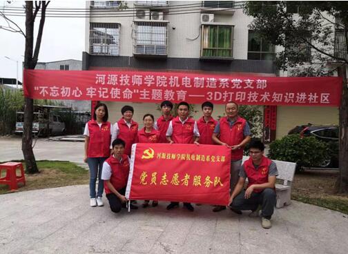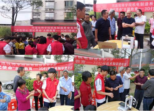 為扎實推進“不忘初心、牢記使命”主題教育活動,深入實踐不忘教育初心,響應學院黨委“五個一”活動之“為身邊群眾辦一件實事”的號召,2019年10月24日,機電制造系黨支部組織黨員教師和學生走進河源市東源縣仙塘鎮(zhèn)仙塘村委會西建村社區(qū)開展“3D打印技術知識進社區(qū)”志愿服務活動,向村民介紹3D打印技術的相關知識。