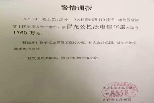 新京報訊(記者李禹潼 周佳淇)30日,一則由清華大學液晶大樓物業(yè)服務(wù)中心發(fā)布的“警情通報”在網(wǎng)絡(luò)上熱傳,通報稱,8月29日晚上23點25分,中關(guān)村派出所110接報,海淀區(qū)藍旗營小區(qū)清華大學一老師,被冒充公檢法電信詐騙人民幣1760萬元。