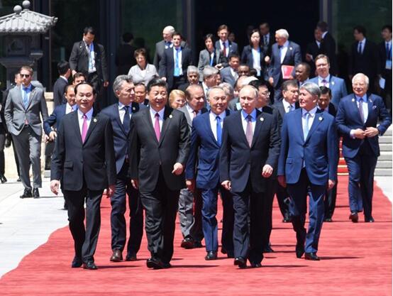 5月15日,“一帶一路”國際合作高峰論壇圓桌峰會在北京雁棲湖國際會議中心舉行,國家主席習(xí)近平主持會議并致開幕辭。這是第一階段會議結(jié)束后,習(xí)近平同外方代表團(tuán)團(tuán)長及嘉賓步出雁棲湖國際會議中心。新華社記者 饒愛民 攝